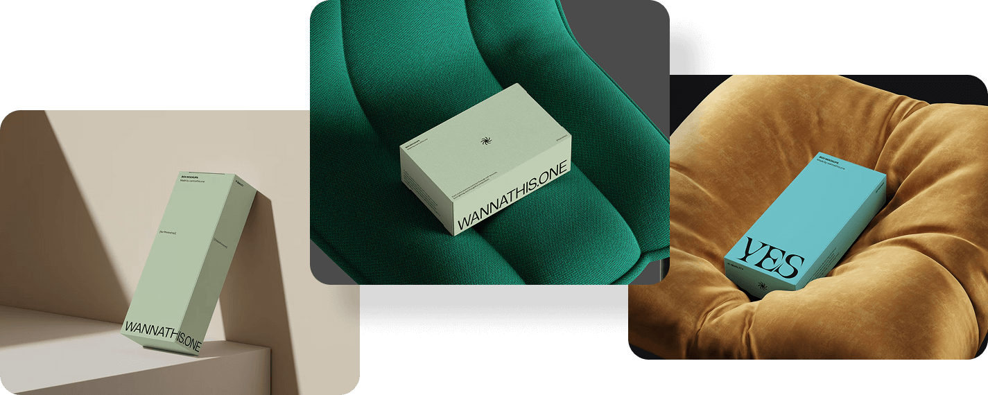 Packaging mockups for product boxes, mailer boxes and gift boxes. Every angle and composition is considered so your packaging design looks as good on screen as it will in person.
