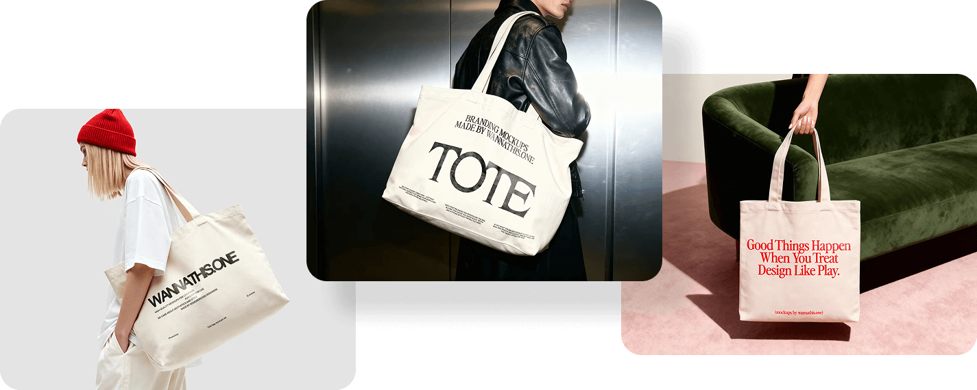 Tote bag mockups that make your print and pattern work feel tangible. Carried, folded, hung or laid flat in styled scenes. Open in Figma or PSD and place your design right away.