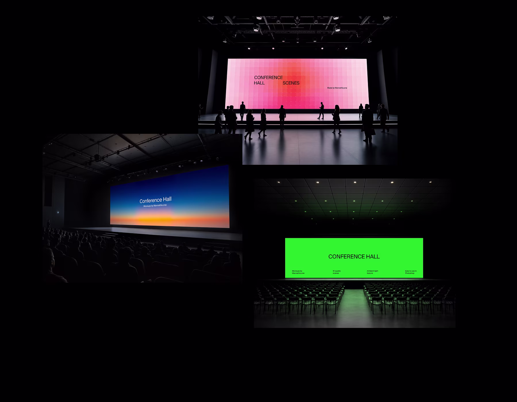A huge screen. A dark room. All eyes on your design. This mockup set captures the drama of a real conference hall with 10 versatile scenes and a standout feature: the ambient lighting reacts to your visuals, making the entire space reflect your colors. Perfect for showcasing bold branding, moody presentations, or cinematic UI. Fully editable in Photoshop.