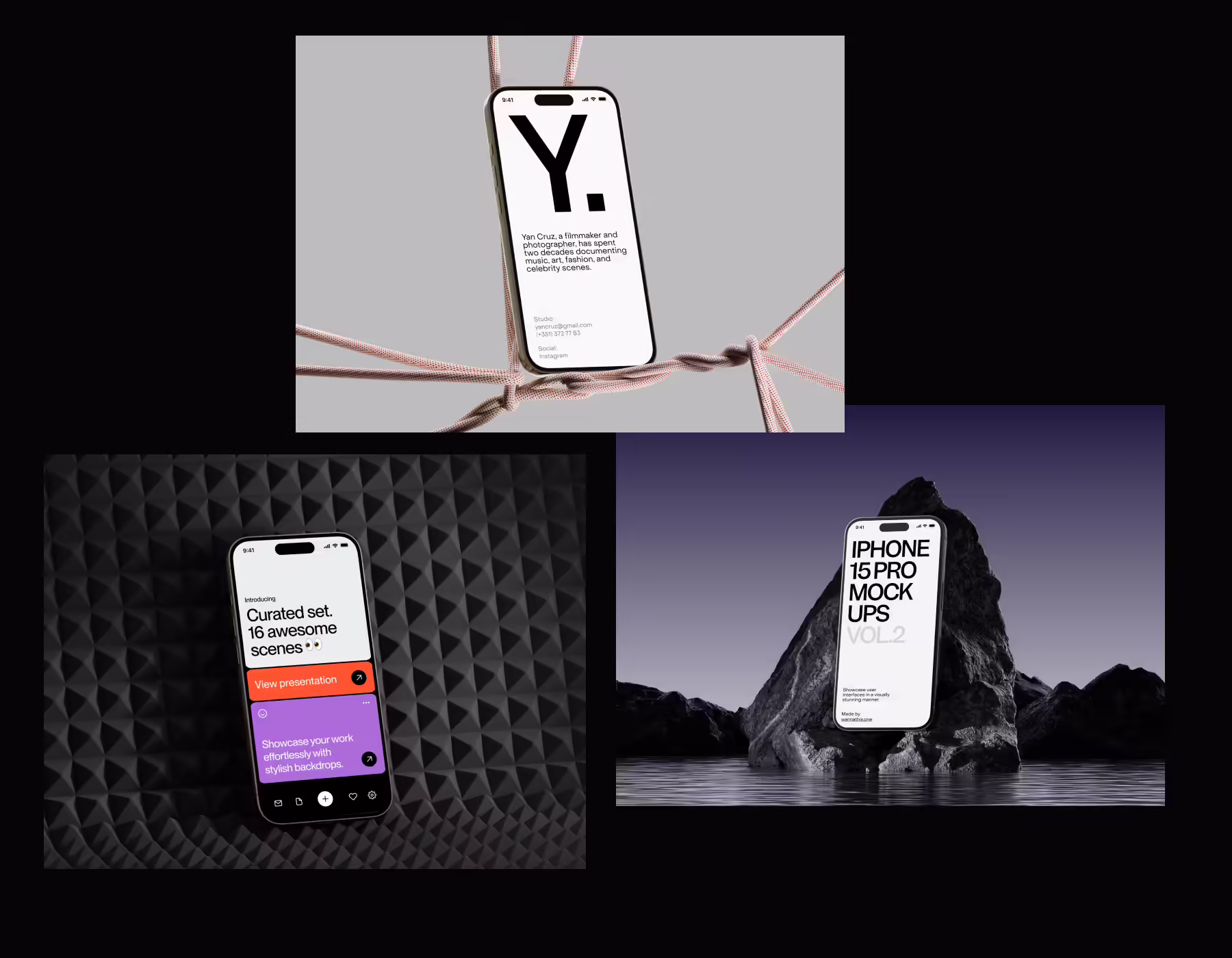Step into creativity with our iPhone environment mockup collection. 16 beautiful compositions. From rocky landscapes to futuristic surfaces, splines and inflatable objects. Each scene was created to enhance your presentations. Showcase your work effortlessly with style. Compatible with Figma and Photoshop for easy use. Upgrade your design game today!