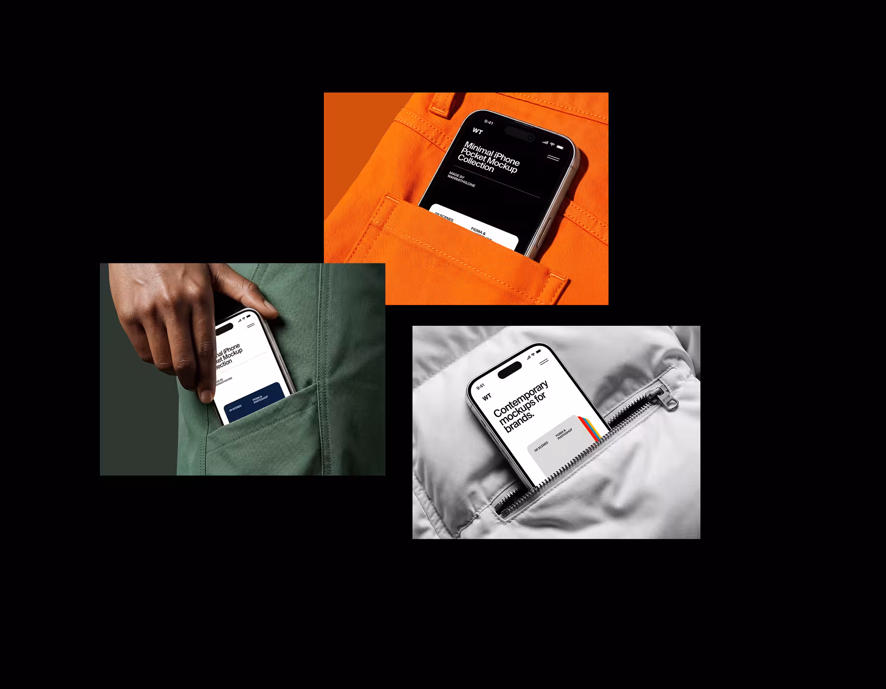 Your design in a pocket, wrapped in fabric, pulled out by hand. iPhone mockups set against vibrant orange denim, crisp striped shirts, rugged canvas bags, and classic blue jeans. The variety of fabrics, textures and hand positions makes it easy to find the right iPhone scene for any project. Each mockup feels natural and lived in, placing your iPhone screen in a context people instantly recognize. Perfect for showcasing app interfaces, lock screens or notifications in an authentic lifestyle setting.