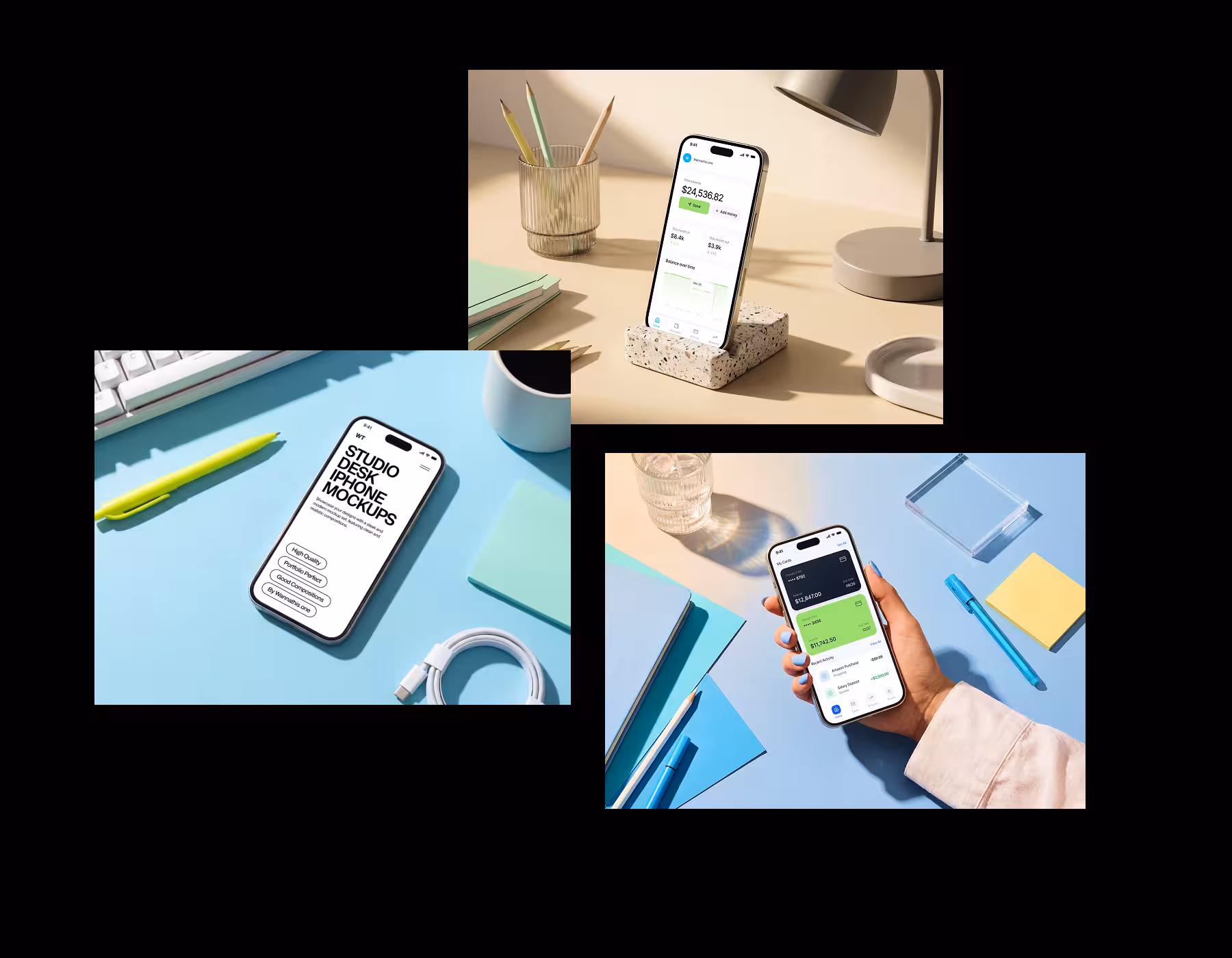 This set captures everyday desk scenes with a calm, creative feel. iPhone mockups are placed among notebooks, pens, keyboards, and small workspace details that feel natural and lived in. Soft colors and gentle light keep the focus on the screen without feeling staged. Each scene works well for apps, websites, and presentations that need a clean but human context. Built for designers who want mockups that blend easily into real projects.
