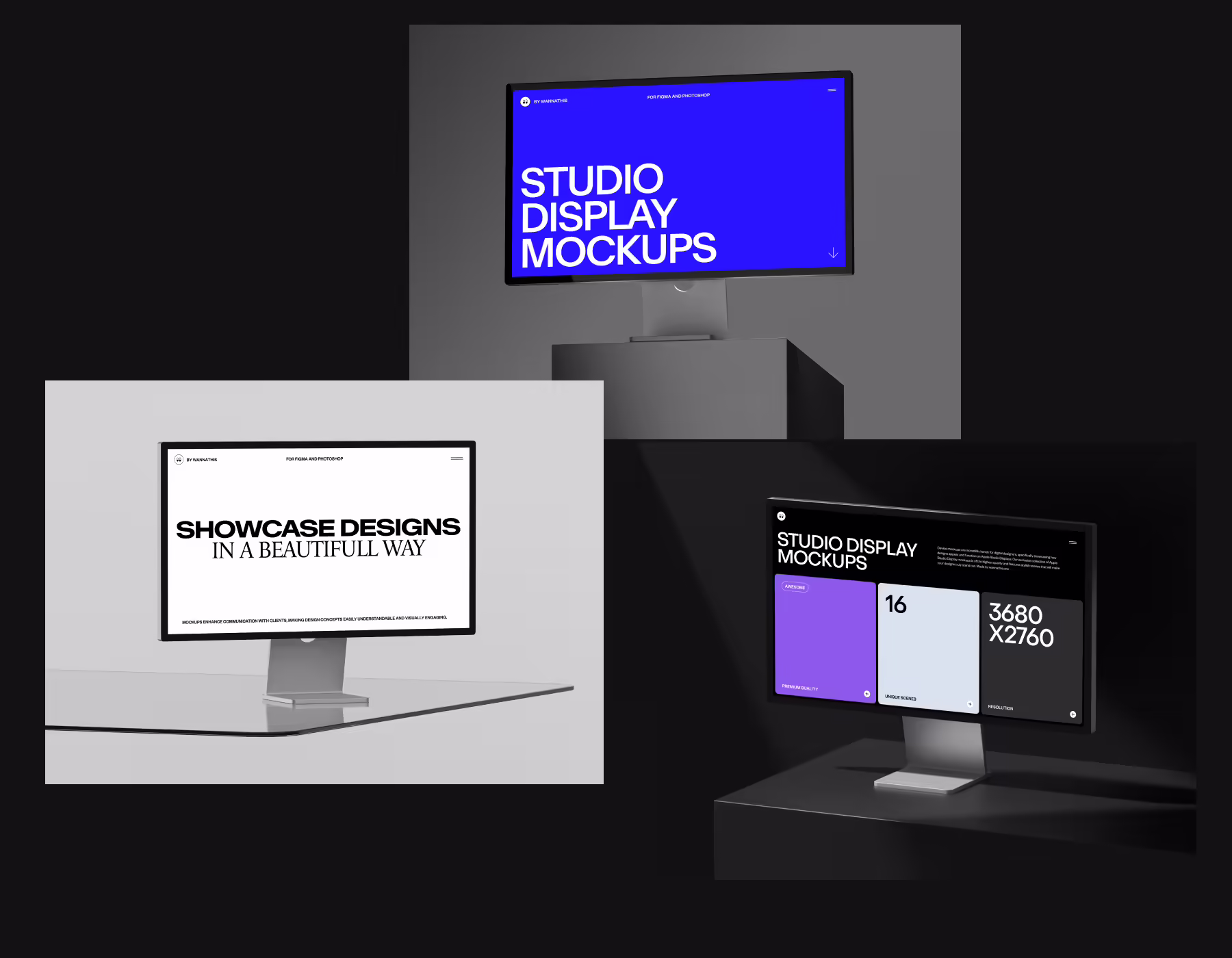 Dive into our Studio Display mockups, showcasing high-quality designs with stylish scenes and versatile lighting to bring your work to life. We've thoughtfully included light and dark scenes, alongside natural setups with stones, grass, and flowers, and even sleek, minimalistic scenes for a clean look. Especially for designers, we offer 7 scenes with transparent backgrounds, giving you the freedom to customize the backdrop color to fit your project perfectly. This big variety ensures there's a fitting scene for every type of project, making it simpler than ever to impress your audience.